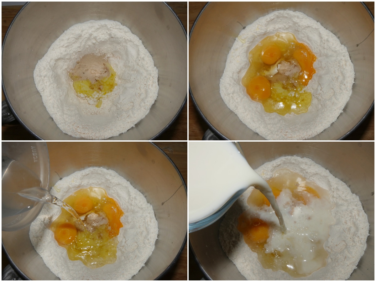 Unite in una ciotola farina, patate, lievito, zucchero, uova, acqua e latte e iniziate a lavorare.