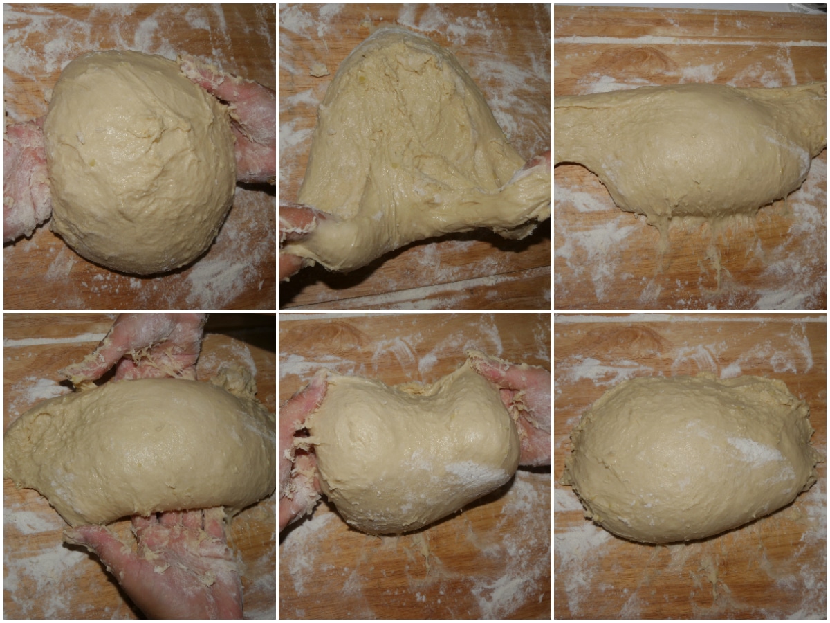 Otterrete un impasto molto morbido e appiccicoso: trasferitelo sul piano di lavoro leggermente infarinato e lasciate riposare per 15 minuti, poi effettuate delle pieghe (qui la guida per farlo la meglio), rimettete nella ciotola, coprite con pellicola e lasciate riposare per almeno 1 ora o fino al raddoppio.
