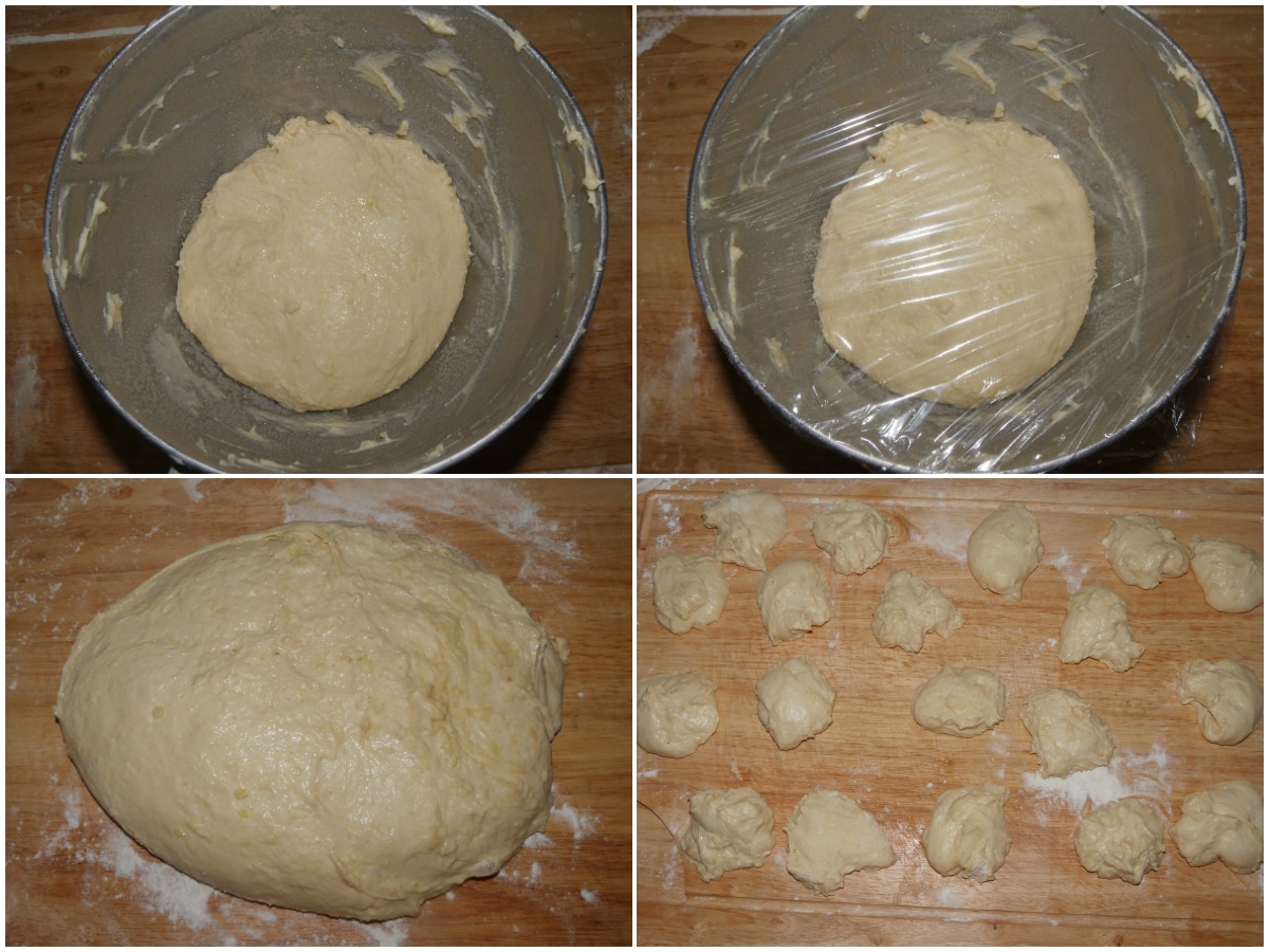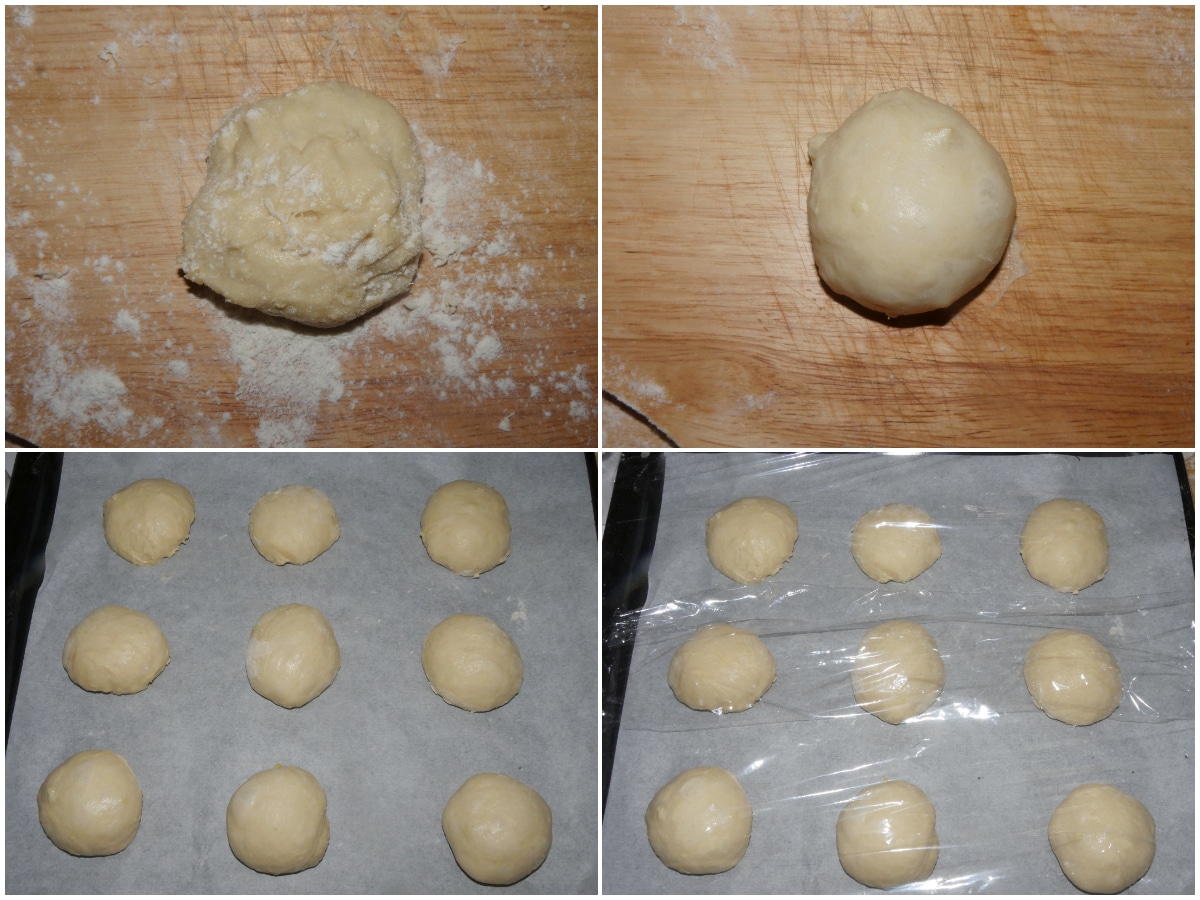 Sagomate l'impasto a forma di palline, disponetele sulla teglia rivestita di carta forno, bene separate tra loro, coprite con pellicola e lasciate lievitare ancora per almeno 30 minuti o finché non saranno quasi raddoppiate.
