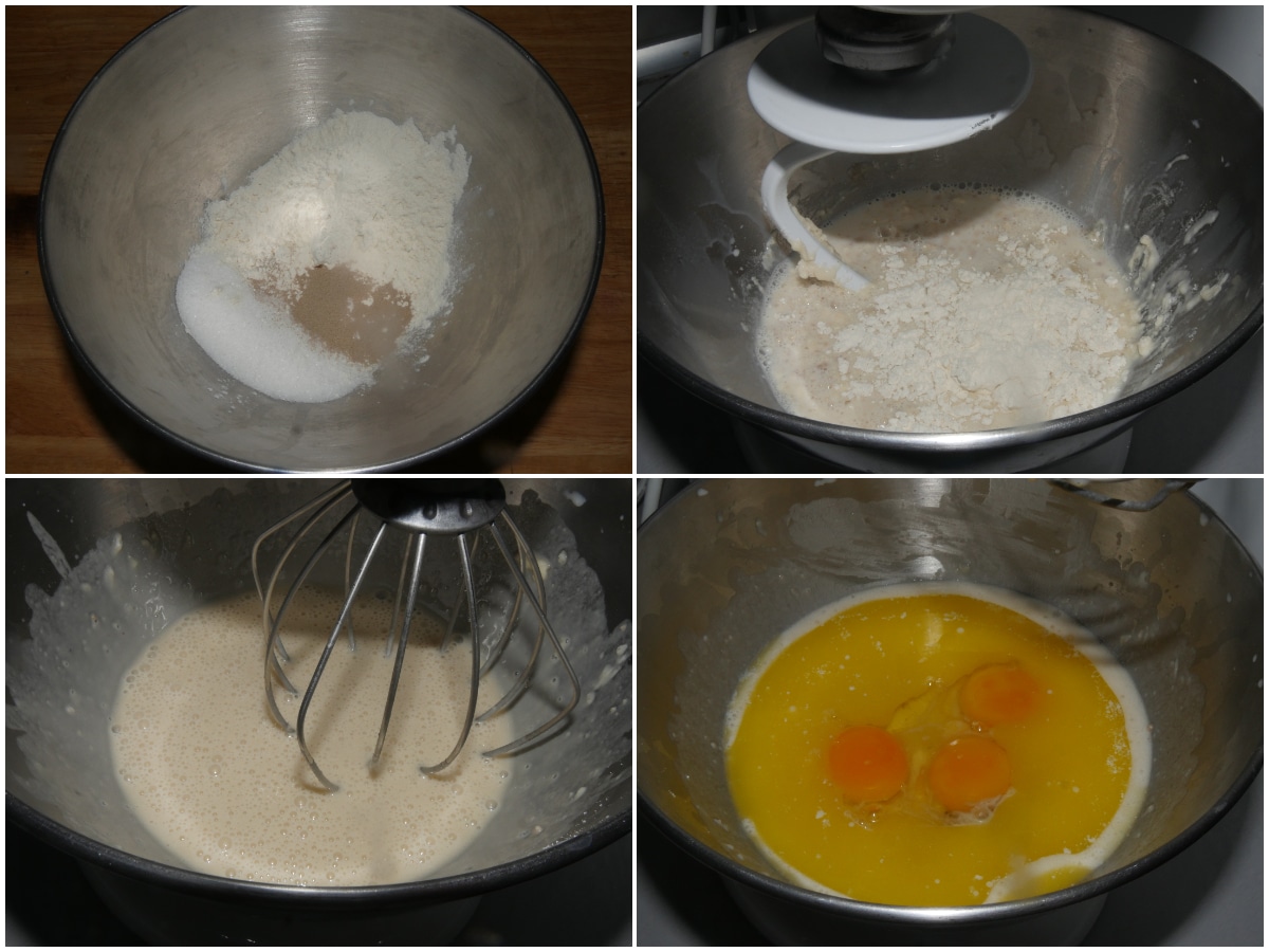 Unite 1/4 della farina, lo zucchero e il lievito in una ciotola, aggiungete il latte tiepido e iniziate a impastare.