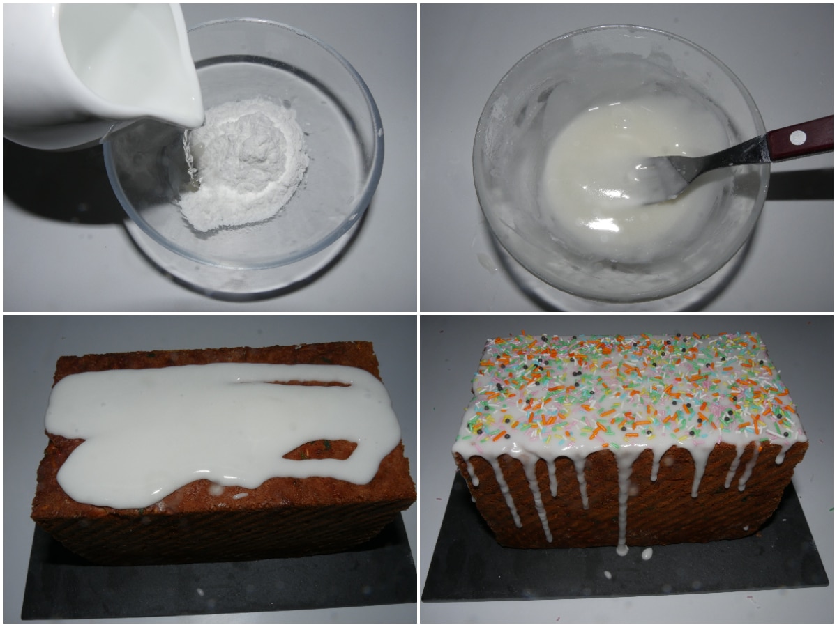 Lasciate raffreddare completamente la brioche, quindi preparate la glassa mescolando latte e zucchero a velo fino ad ottenere un composto denso ma fluido: distribuitelo sulla brioche, facendolo colare un pochino oltre i bordi, e decorate con le codette.