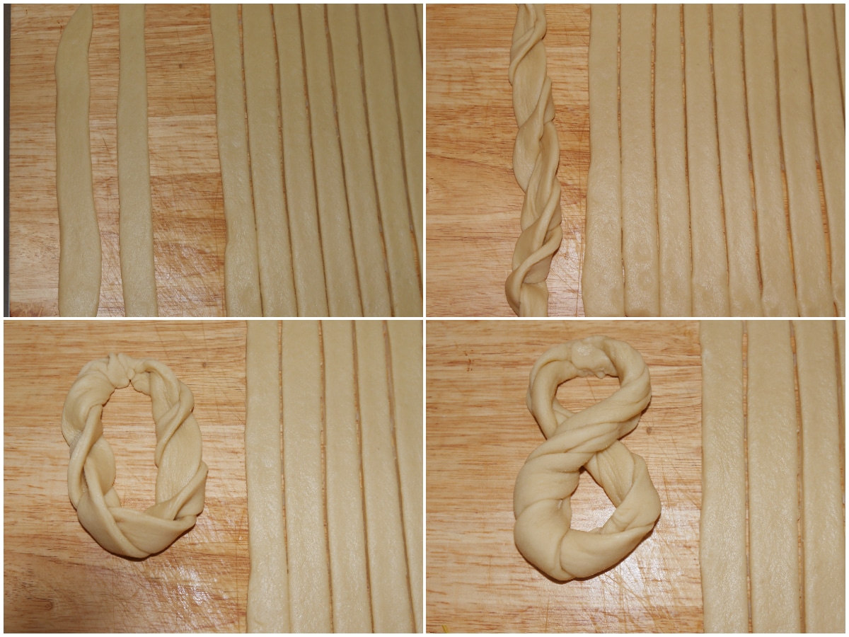 Proseguite così con le altre strisce, poggiano man mano i vostri 8 sulla teglia rivestita di carta forno.