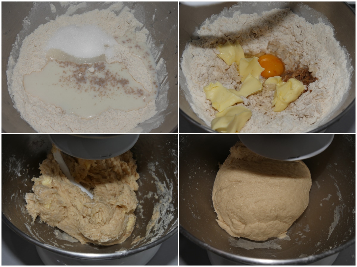 Preparate quindi l'impasto: unite farina, lievito, zucchero e latte in una ciotola e iniziate a lavorare, poi incorporate anche uovo, burro, sale e aromi e impastate fino ad ottenere un panetto omogeneo.
