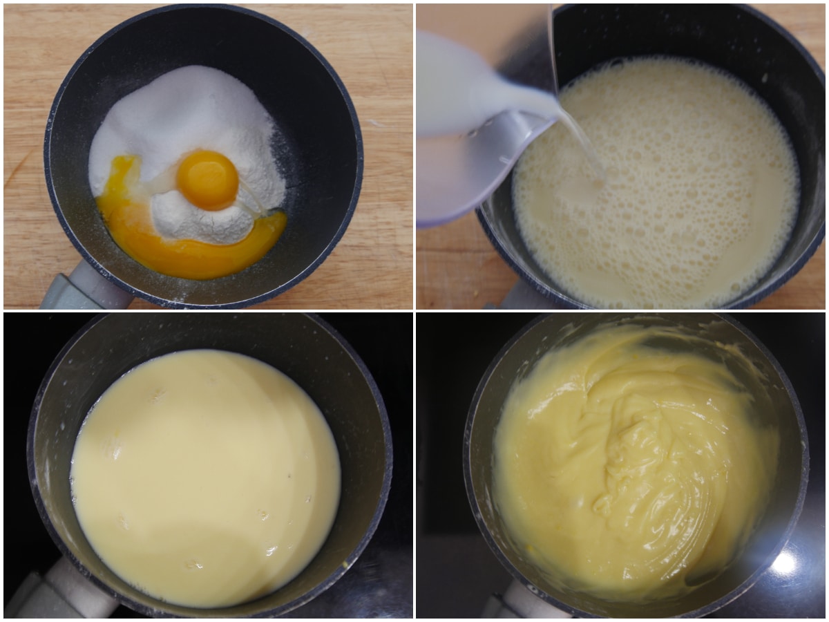 Innanzitutto preparate la crema, in modo da lasciarla poi raffreddare completamente, con pellicola per alimenti a contatto: montate i tuorli con lo zucchero, incorporate la maizena e gli aromi e infine anche il latte.