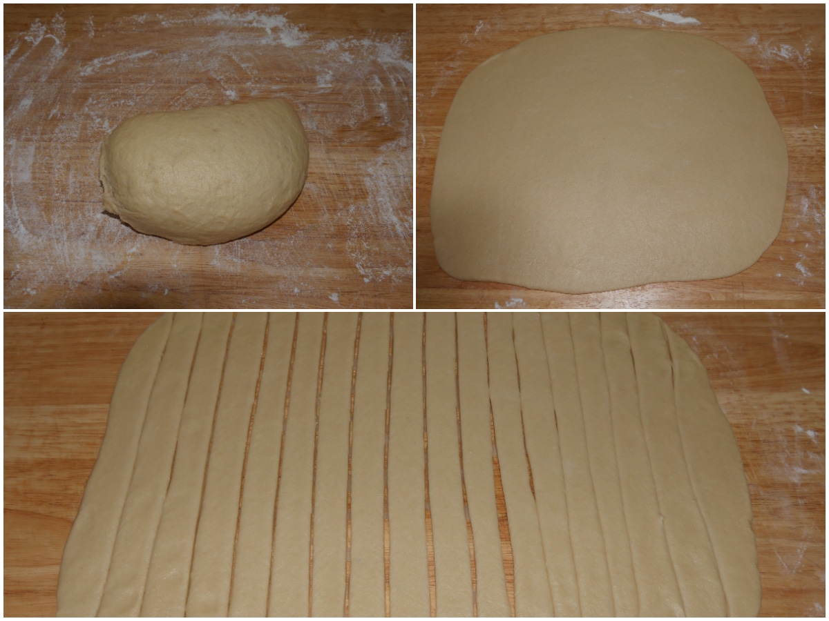 Riprendete l'impasto e stendetelo in una sfoglia rettangolare da circa 30x40 cm, quindi dividetela con un coltello a lama liscia, dal lato lungo, in 18 strisce da circa 2 cm.