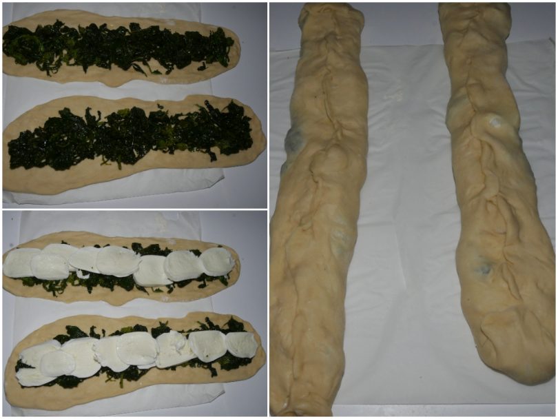 Adagiate uno strato di friarielli e poi la mozzarella.Chiudete la pasta ottenendo così due cilindri.