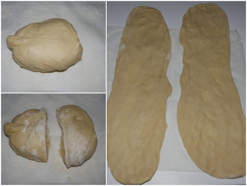 Una volta lievitata la pasta, ribaltatela su un piano infarinato e dividetela in due parti, quindi stendetela delicatamente con le mani ottenendo due rettangoli.