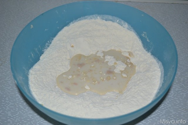 In un'ampia ciotola mettete la farina, fate un buco al centro e versare il composto con il lievito