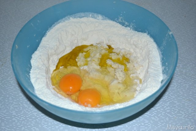 Aggiungere ora le uova, l'olio e il sale ed impastare fino ad ottenere un impasto morbido ed elastico