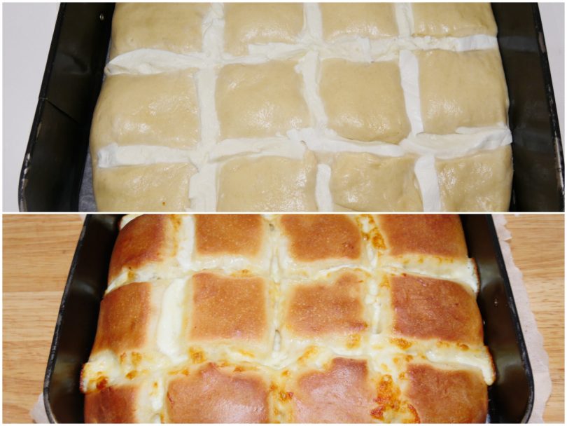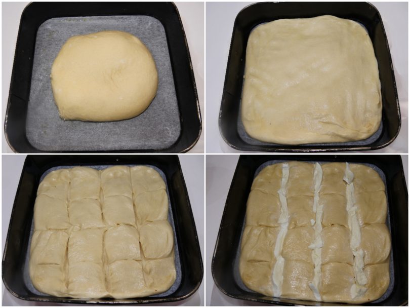 Con una lama liscia e affilata, create dei solchi sull'impasto, creando 16 quadrotti uguali, quindi iniziate a infilare le listarelle di mozzarella nei solchi, riempiendoli tutti, sia verticali che orizzontali, poi lasciate lievitare di nuovo per circa 1-2 ore o fino al raddoppio.