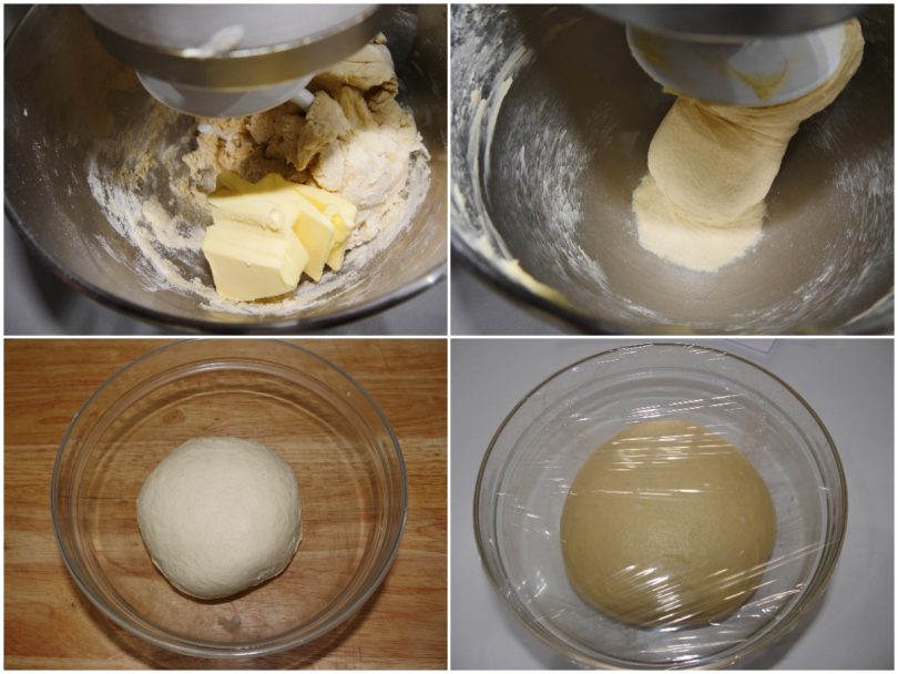 Infine aggiungete anche il burro a pezzetti a impastate fino a far incordare per bene l'impasto, quindi trasferite il panetto in una ciotola leggermente unta, coprite con pellicola e fate lievitare nel forno spento con la lucina accesa per circa 2 ore o fino al raddoppio.