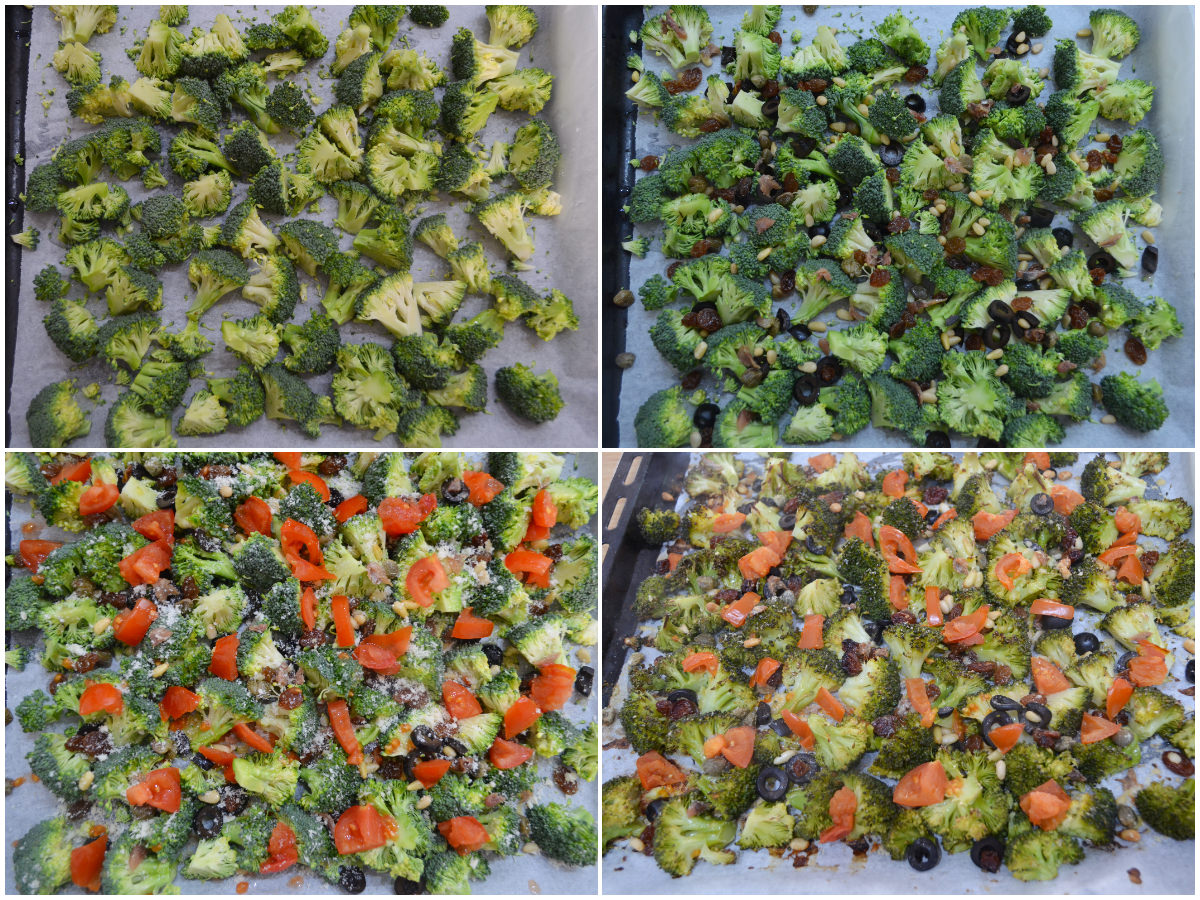 Disponete le cimette di broccolo sulla teglia rivestita di carta forno, quindi aggiungete pomodorini, olive, capperi, uvetta, pinoli, un pizzico di sale e di peperoncino.