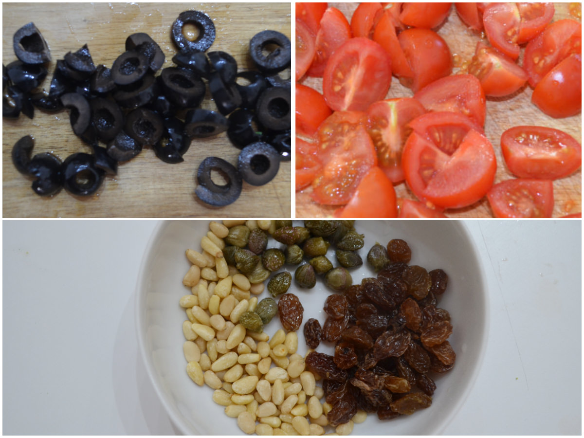 Preparate gli altri ingredienti: lavate e tagliate in spicchi i pomodorini, tagliate a fettine le olive, ammollate l'uvetta in acqua calda e strizzatela leggermente, quindi unitela a capperi dissalati e pinoli.