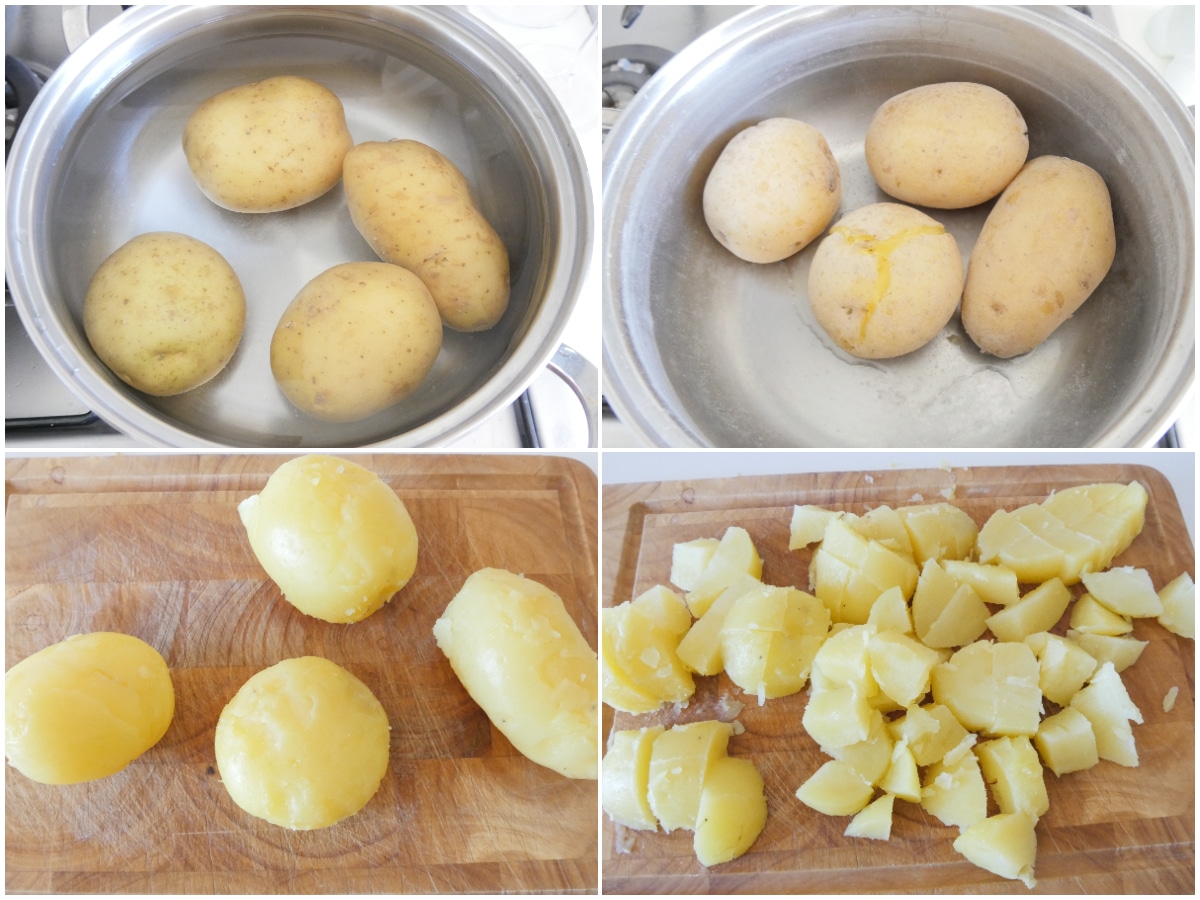 Lavate bene le patate, mettetele in una pentola con acqua fredda e cuocete per circa 25 minuti dal bollore: dovranno essere abbastanza morbide ma ancora belle sode.