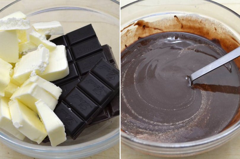 Passiamo ora alla preparazione dei brownies: sciogliete burro e cioccolato a bagnomaria o al microonde e lasciate intiepidire.