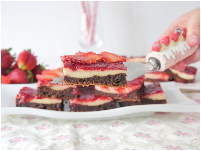 I brownies alle fragole sono dei dolcetti assolutamente fantastici: scioglievoli e goduriosi come pochi, ma con la freschezza e l'acidità del formaggio a stemperare il tutto. La preparazione può sembrare lunga ed elaborata, ma vi assicuro che non è difficile e poi il risultato vi ripagherà della fatica, ve lo assicuro! Immaginate una base di brownies burroso e soprattutto super cioccolattoso, poi la crema cheesecake, fresca e sbarazzina, e infine la dolcezza delle fragole a mo' di ciliegina sulla torta :P