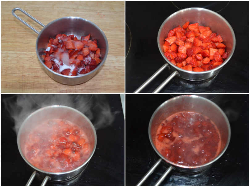 Iniziamo dalla salsa alle fragole: pulite le fragole, eliminate il picciolo e tagliatele a pezzi, lasciandone da parte qualcuna a fettine per la decorazione finale.