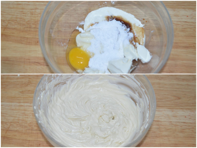 Ora preparate la crema al formaggio cheesecake: amalgamate il philadelphia con zucchero, uovo, vaniglia e maizena.