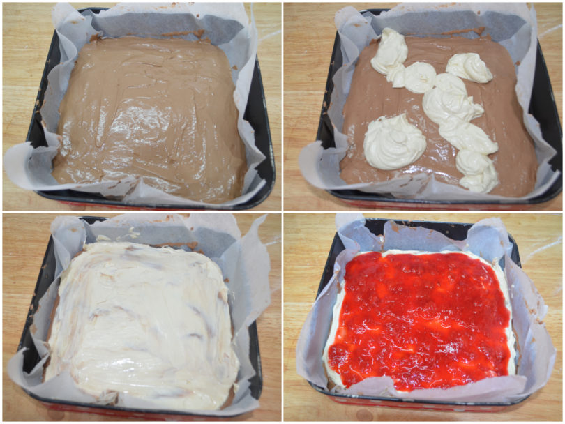 Aggiungete la crema al formaggio sopra all'impasto dei brownies cercando di distribuirla in maniera uniforme.