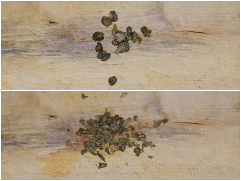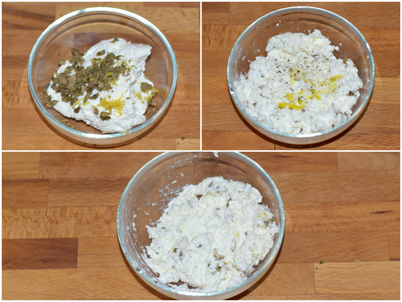 Unite in una ciotola ricotta, capperi, buccia di limone, olio e pepe e amalgamate.