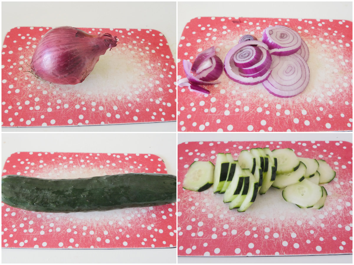 Pelate la cipolla e tagliatela a fettine non troppo spesse, quindi lavate il cetriolo, eliminate le estremità e una parte della buccia e tagliatelo a rondelle abbastanza sottili.