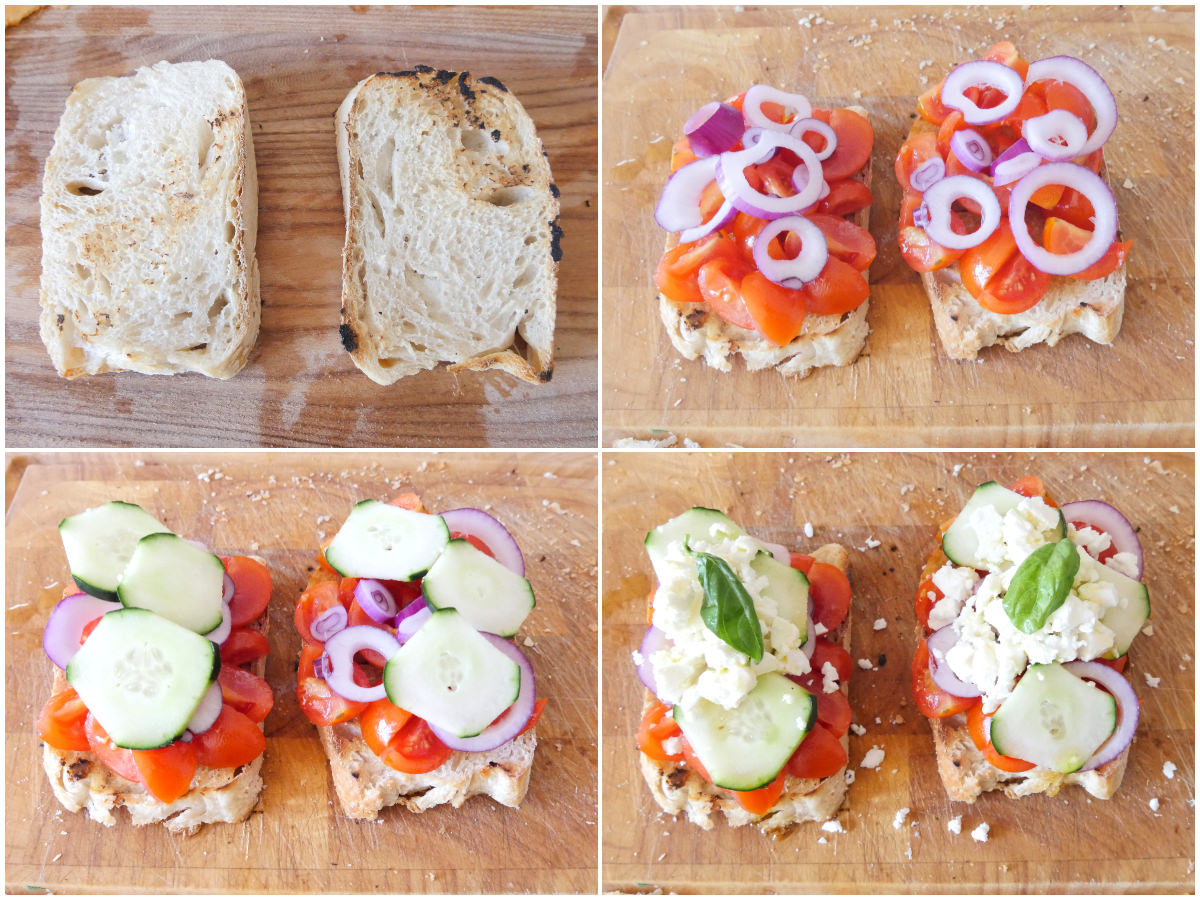Iniziate quindi ad assemblare le vostre bruschette: create uno strato di pomodorini, poi di rondelle di cipolla, poi di cetriolo, e infine aggiungete anche feta e basilico fresco.