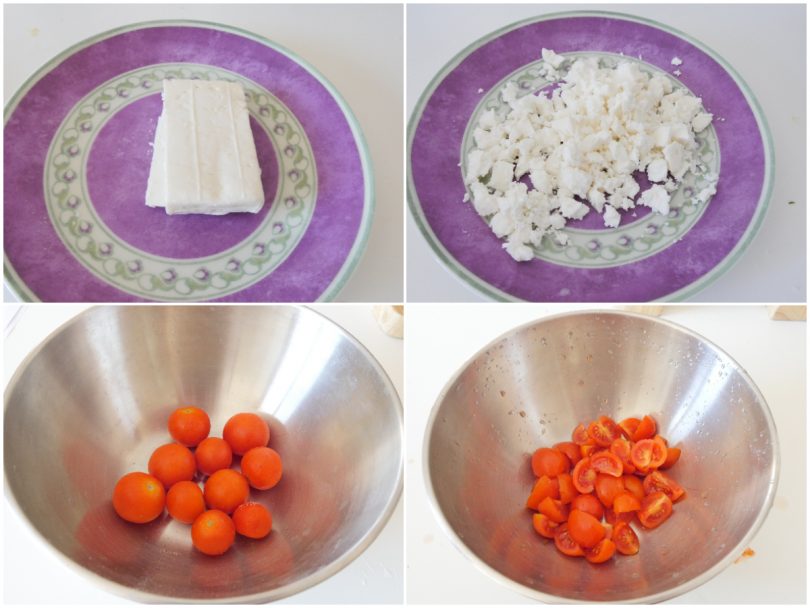 Sbriciolate la feta e, a parte, lavate i pomodorini e tagliateli in 4 (o anche in più parti, se non sono molto piccoli), quindi conditeli con poco sale e olio.