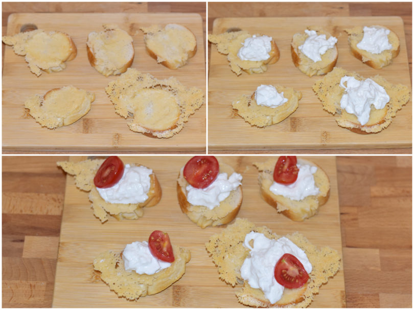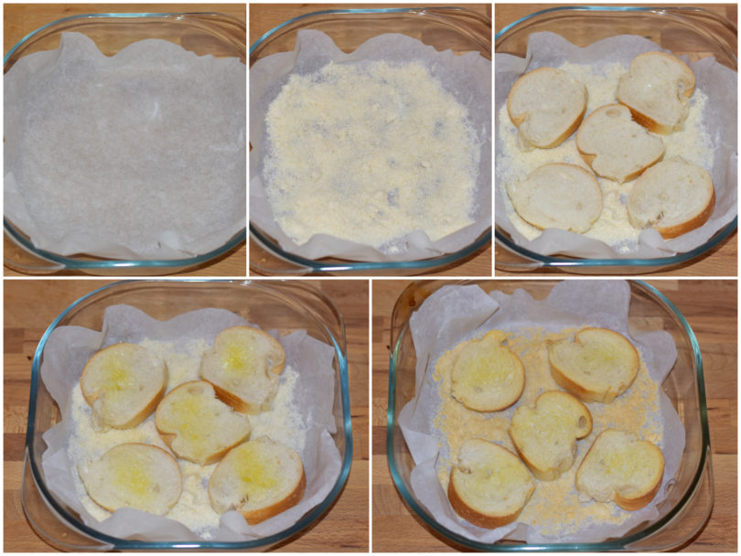 Cospargete il parmigiano su di una teglia rivestita di carta forno, disponeteci sopra il pane e irrorate con un filo d'olio, quindi cuocete per 8-10 minuti o fino a leggera doratura in forno ventilato preriscaldato a 190°C.