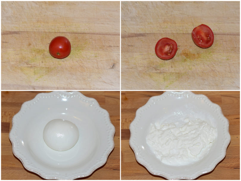 Lavate i pomodorini e tagliateli a metà; aprite la burrata.