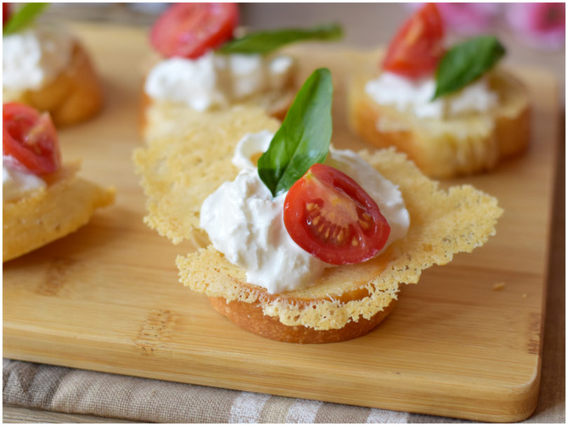 Le vostre bruschette burrata sono pronte, non vi resta che aggiungere il basilico fresco e servirle.