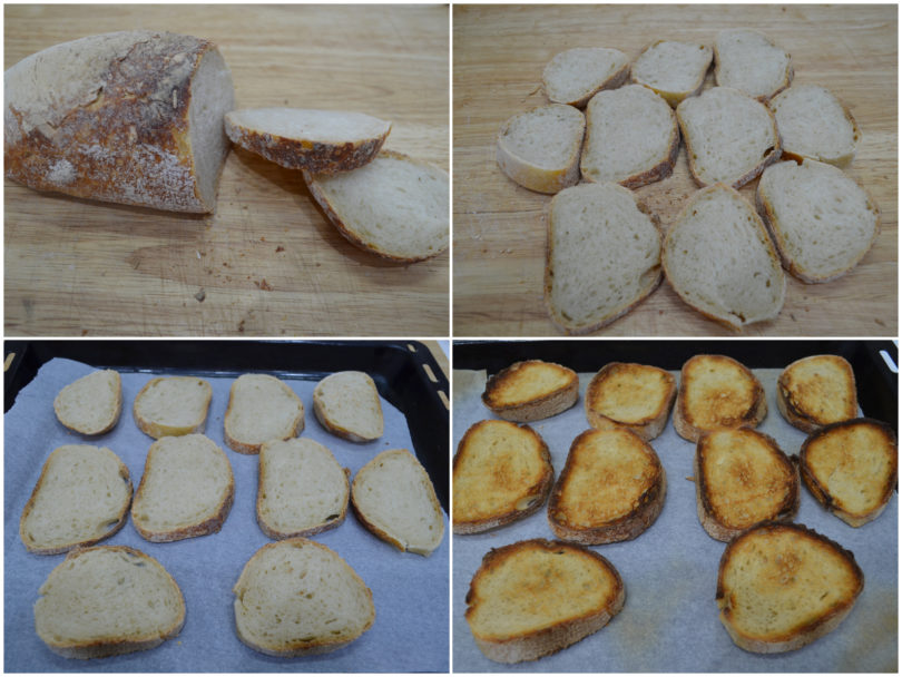 Innanzitutto tagliate il pane a fette, facendole non troppo spesse (1 cm circa, massimo 1,5 cm), e abbrustolitelo su una piastra antiaderente bollente (oppure per 5 minuti in forno ventilato preriscaldato a 180°C).