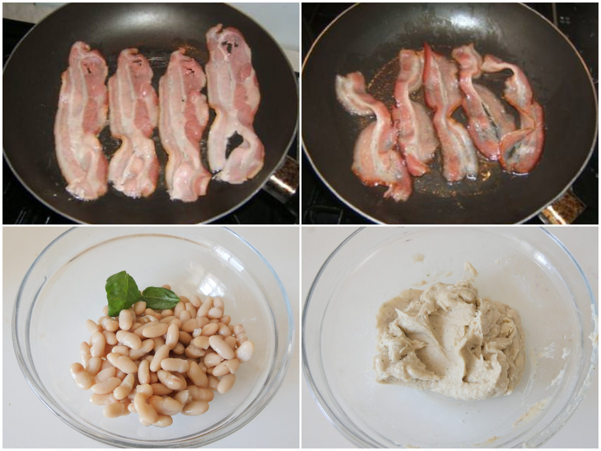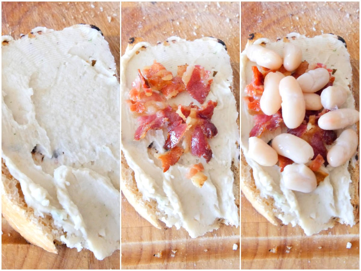 Spalmate la crema di fagioli sul pane, quindi aggiungete un po' di bacon spezzettato e qualche fagiolo intero, e completate con qualche fettina di cipolla.