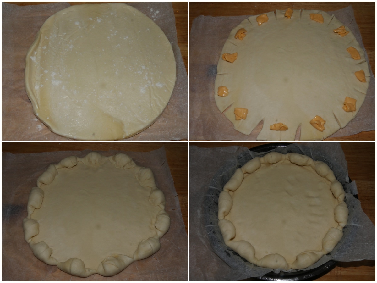 Stendete la pasta per le pizze, ritagliatela a forma di disco (poggiateci sopra la teglia che userete e ritagliate lasciando almeno 2 dita in più di impasto tutto intorno) e mettete da parte gli avanzi di impasto.