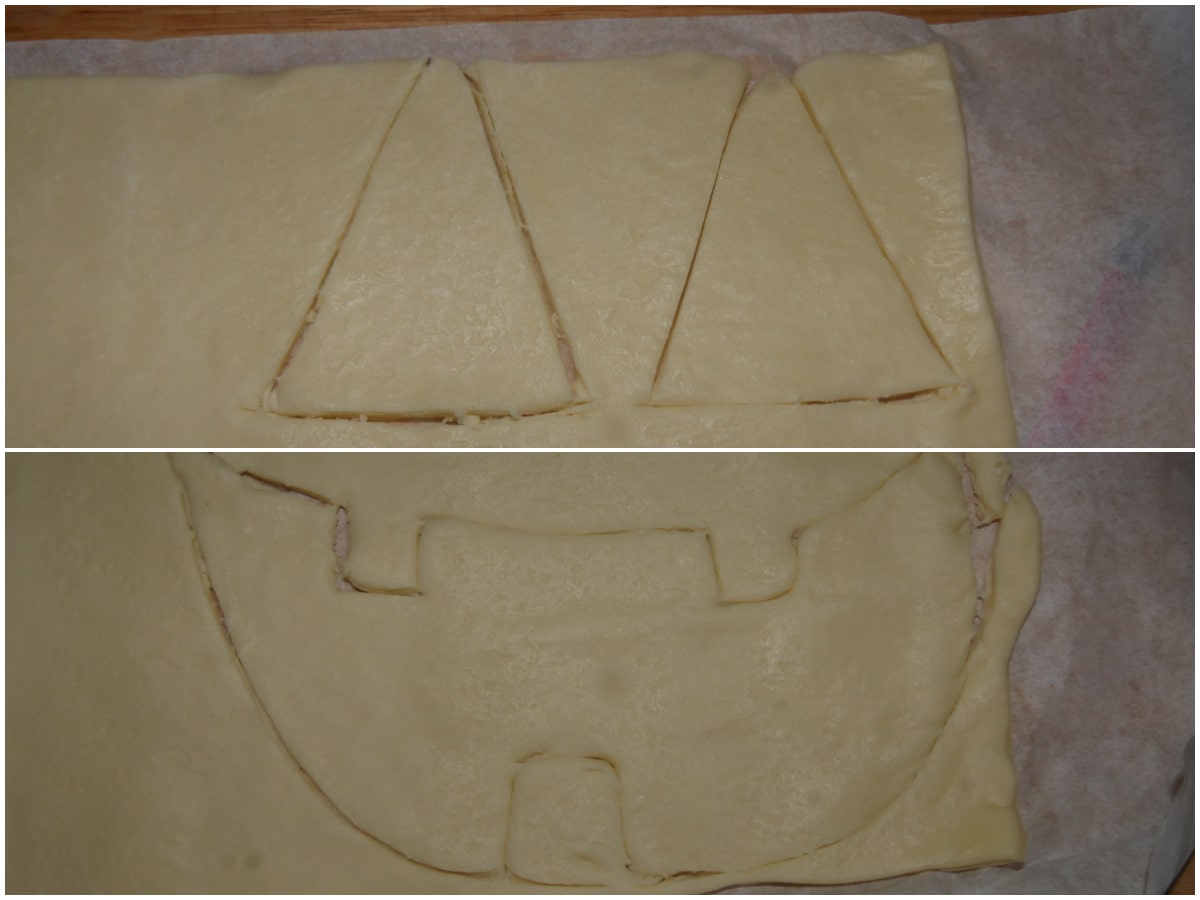 Dagli avanzi di pasta per le pizze ricavate occhi e bocca per la vostra Jack o' lantern (o qualsiasi altro decoro vi piaccia di più: foglie di zucca, cappelli da strega, fantasmini...).