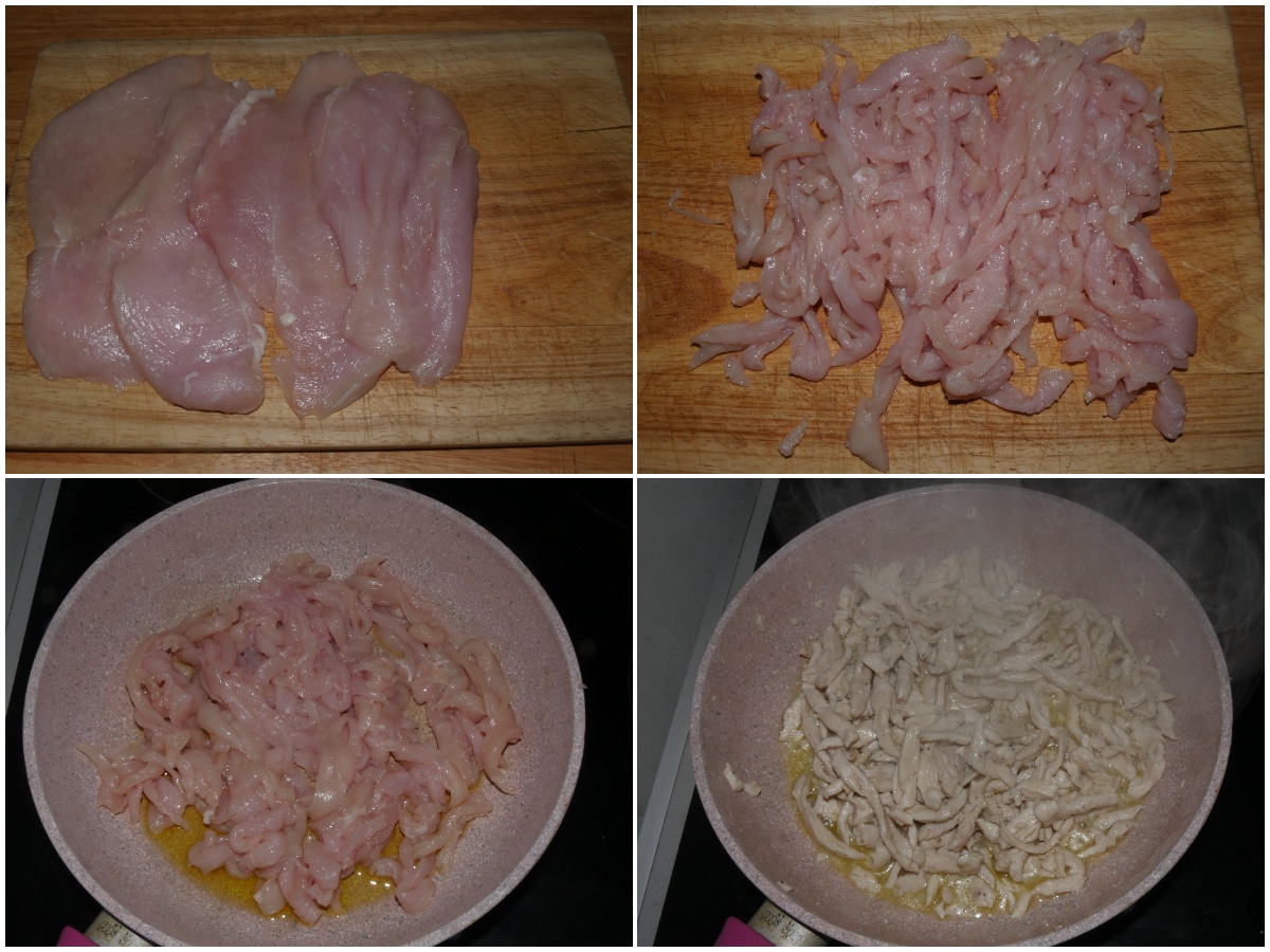Tagliate il pollo a straccetti e saltatelo in padella con sale e olio.