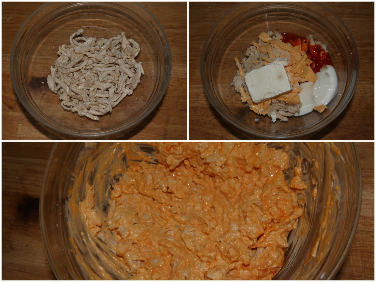 Preparate quindi la farcitura: unite in una ciotola ampia pollo, cheddar, panna acida, formaggio Philadelphia e salsa Buffalo (potete anche usare ketchup o salsa barbecue) e amalgamate.