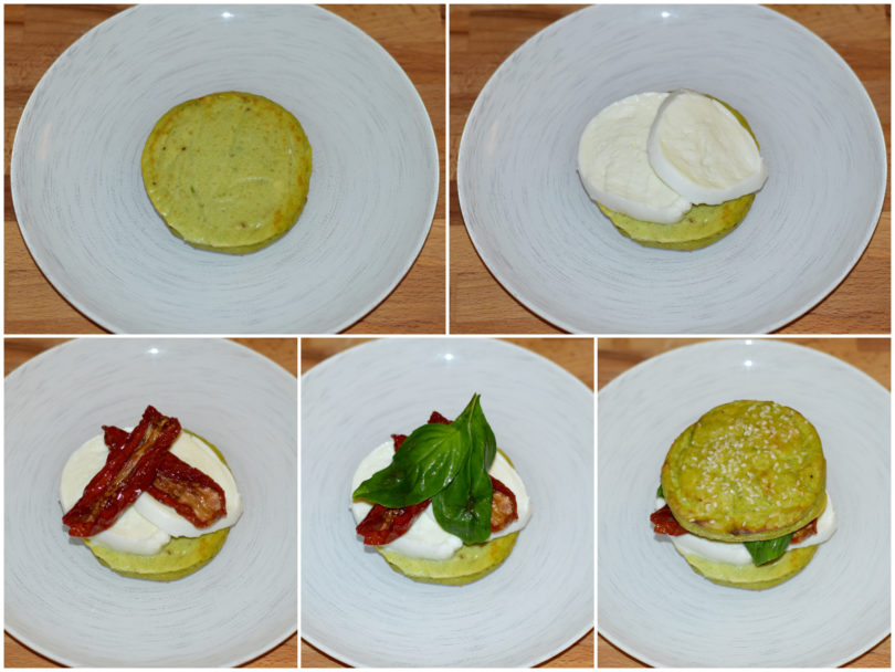 Componete il panino con avocado bun, mozzarella, pomodori secchi, basilico e di nuovo avocado bun.