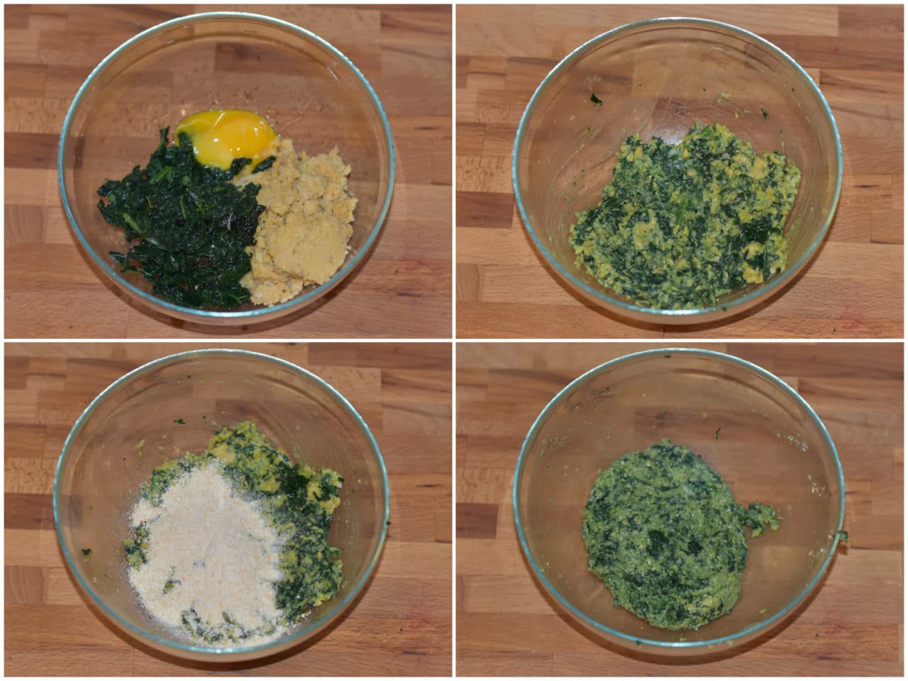 Unite in una ciotola ceci, cavolo e tuorlo, condite con sale e pepe e amalgamate, poi incorporate il pangrattato: dovrete ottenere un composto sodo e malleabile, ma non troppo secco.