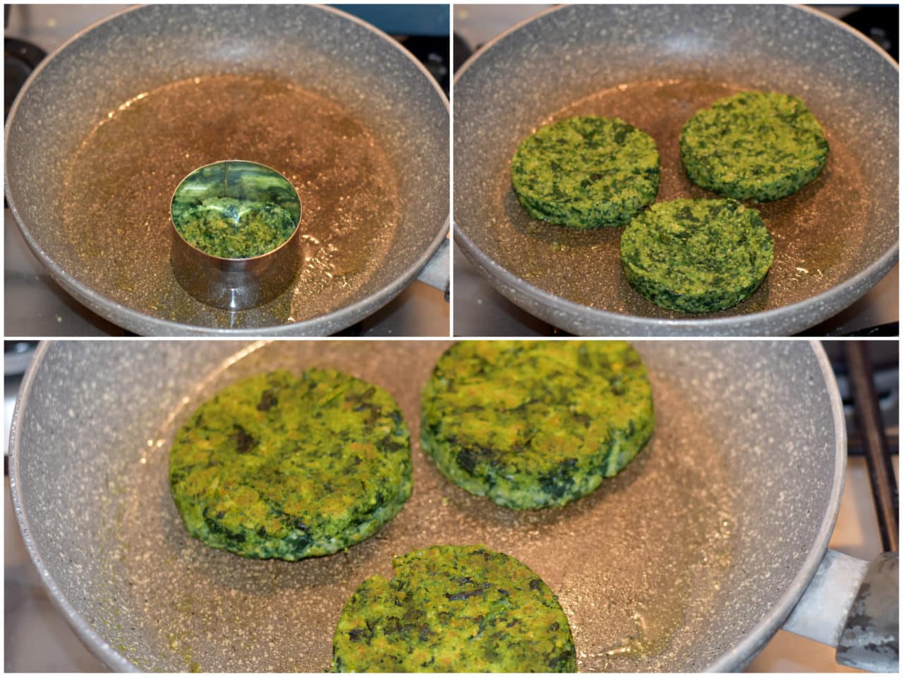 Lasciate scaldare un filo d'olio in una padella antiaderente (potete usare la stessa in cui avete fatto insaporire le foglie di cavolo nero) e createci dentro i burger usando un coppapasta da circa 8 cm, compattandoli bene con il dorso di un cucchiaio.