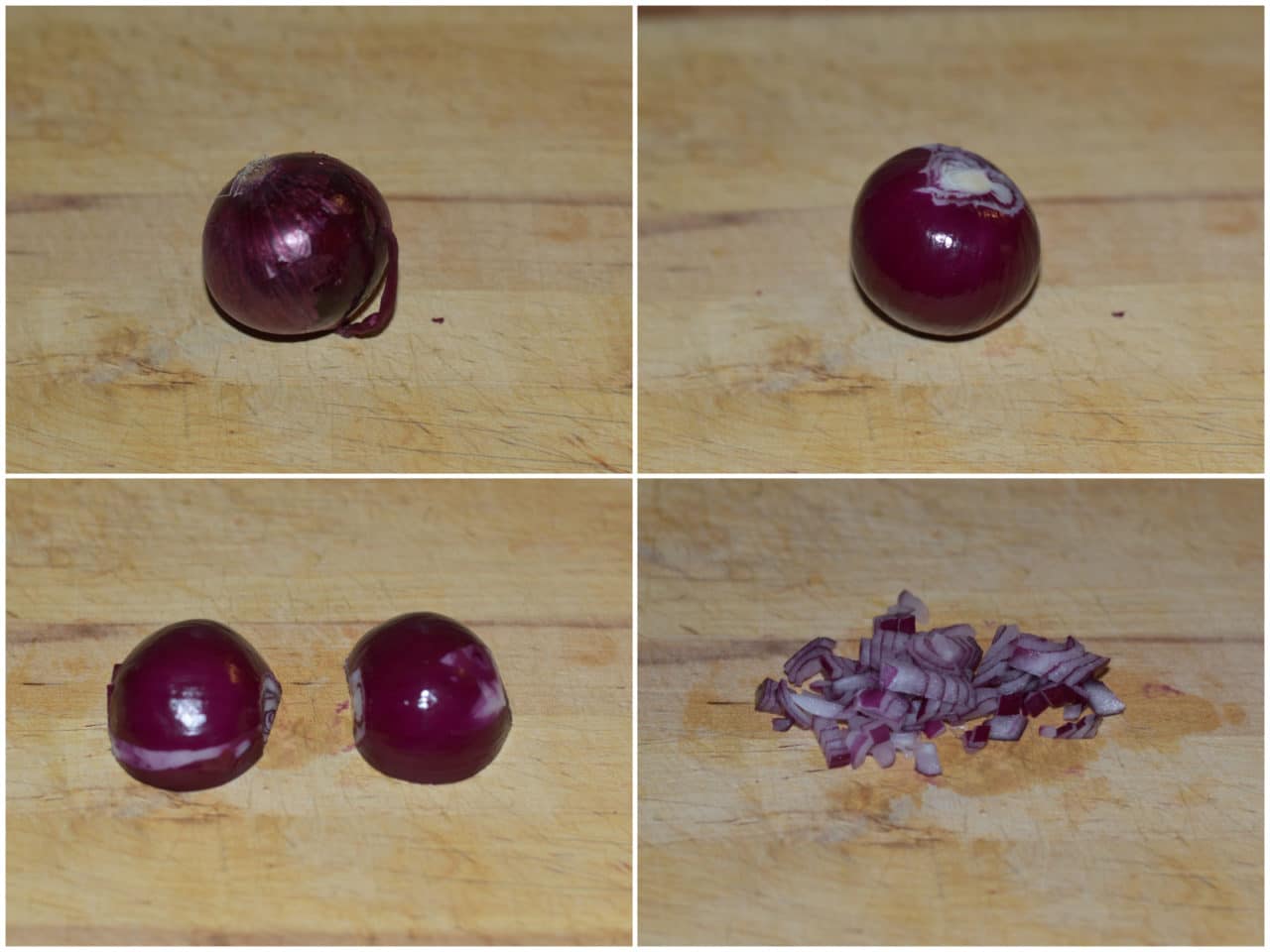 Innanzitutto pulite i funghi e tagliateli a pezzi, quindi mondate la cipolla e tritatela.