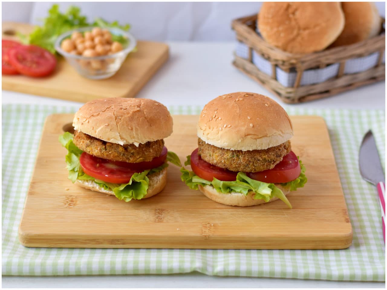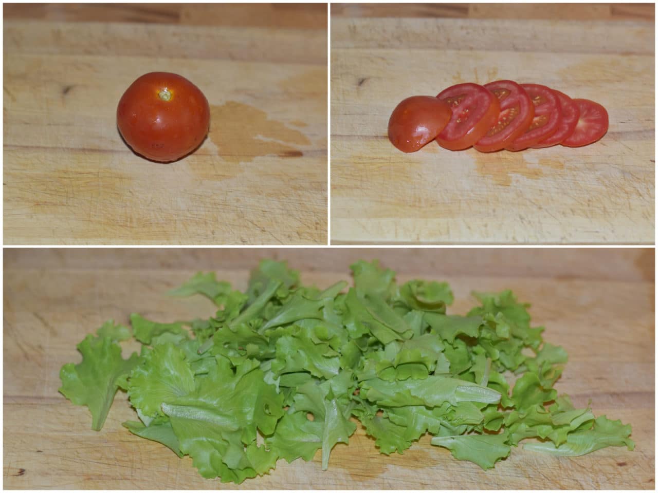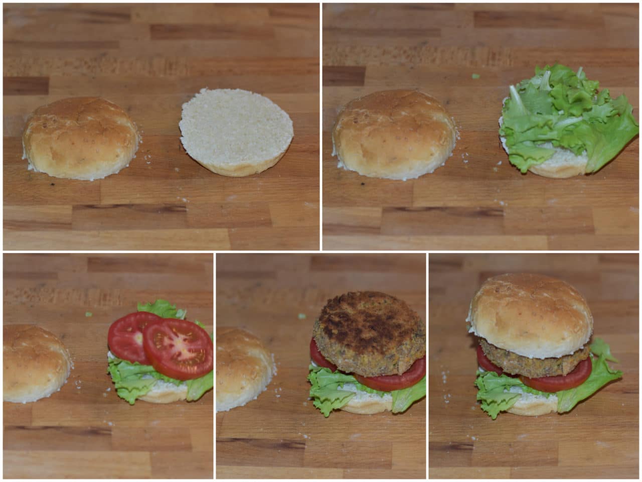 Lavate e mondate lattughino e pomodori, tagliate il panino e farcite, aggiungendo ovviamente anche i burger.