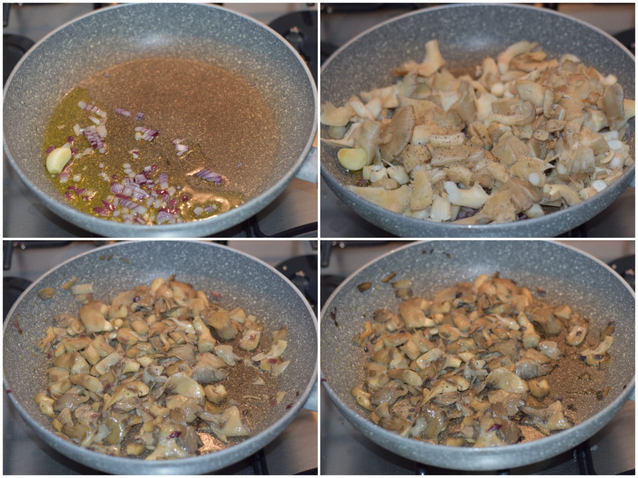 Fate appassire la cipolla in una padella antiaderente con aglio e olio, quindi unite anche i funghi, condite con sale e pepe e portate a cottura (ci vorranno circa 10-15 minuti, a seconda della dimensione dei tocchetti di funghi).