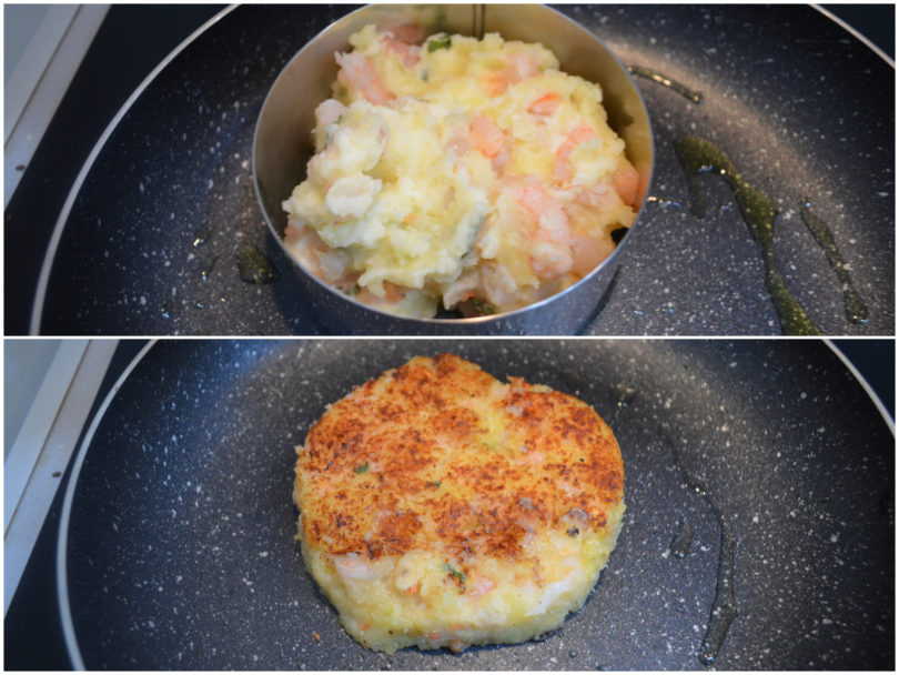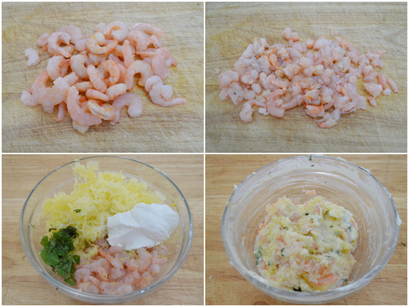 Tritate le code di gamberi al coltello, non troppo finemente, quindi unitele con le patate schiacciate, lo yogurt, il prezzemolo tritato e il sale.