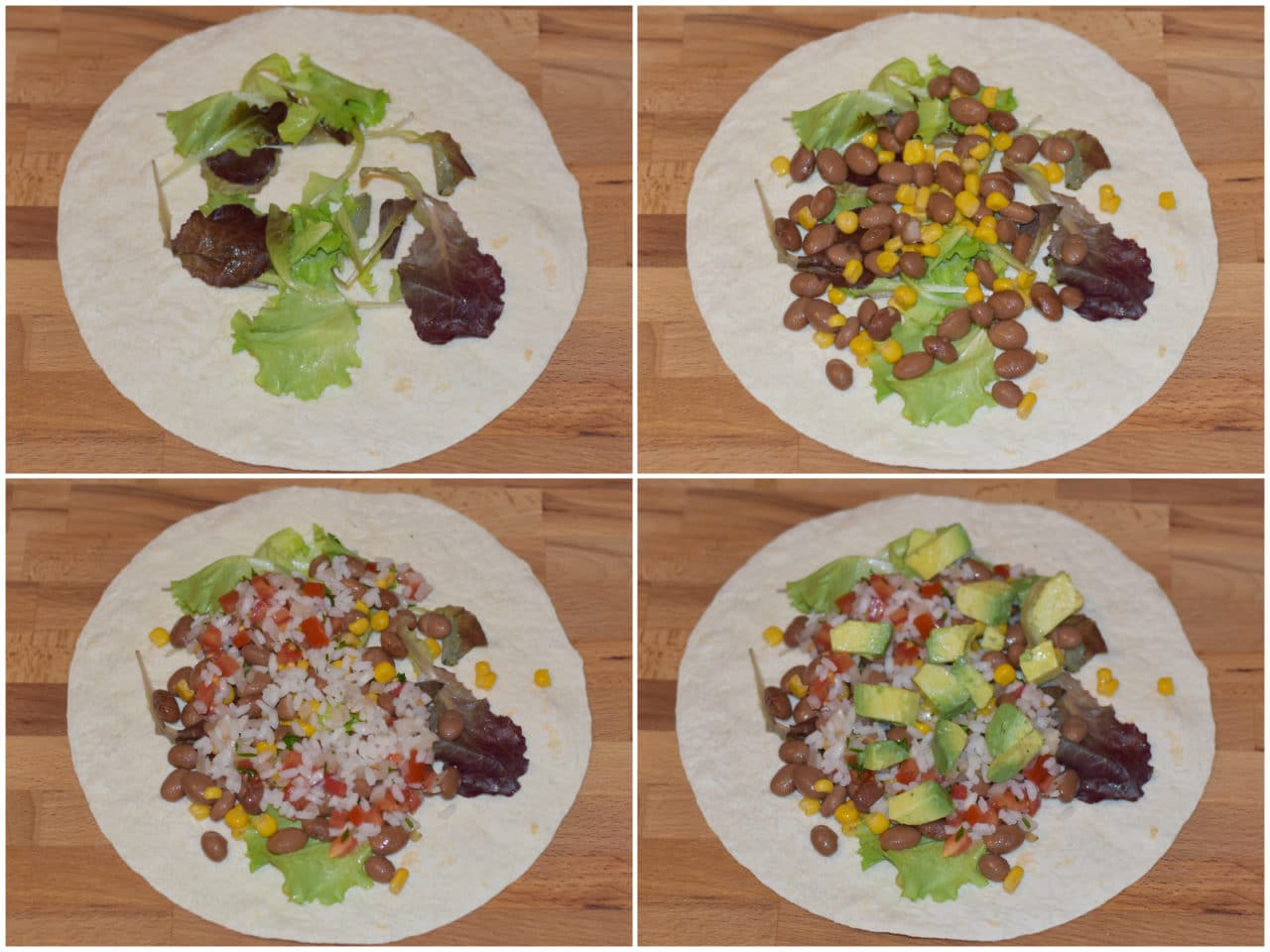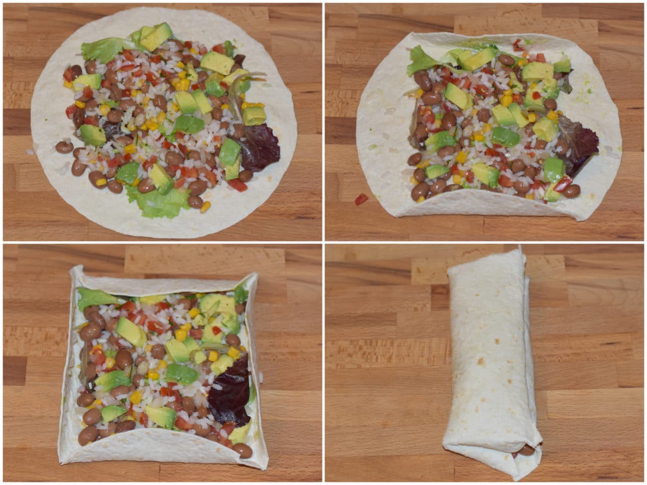 Ripiegate i bordi sopra al ripieno dai 4 lati, poi arrotolate per formare il burrito, poi procedete nello stesso modo anche con l'altra tortilla.