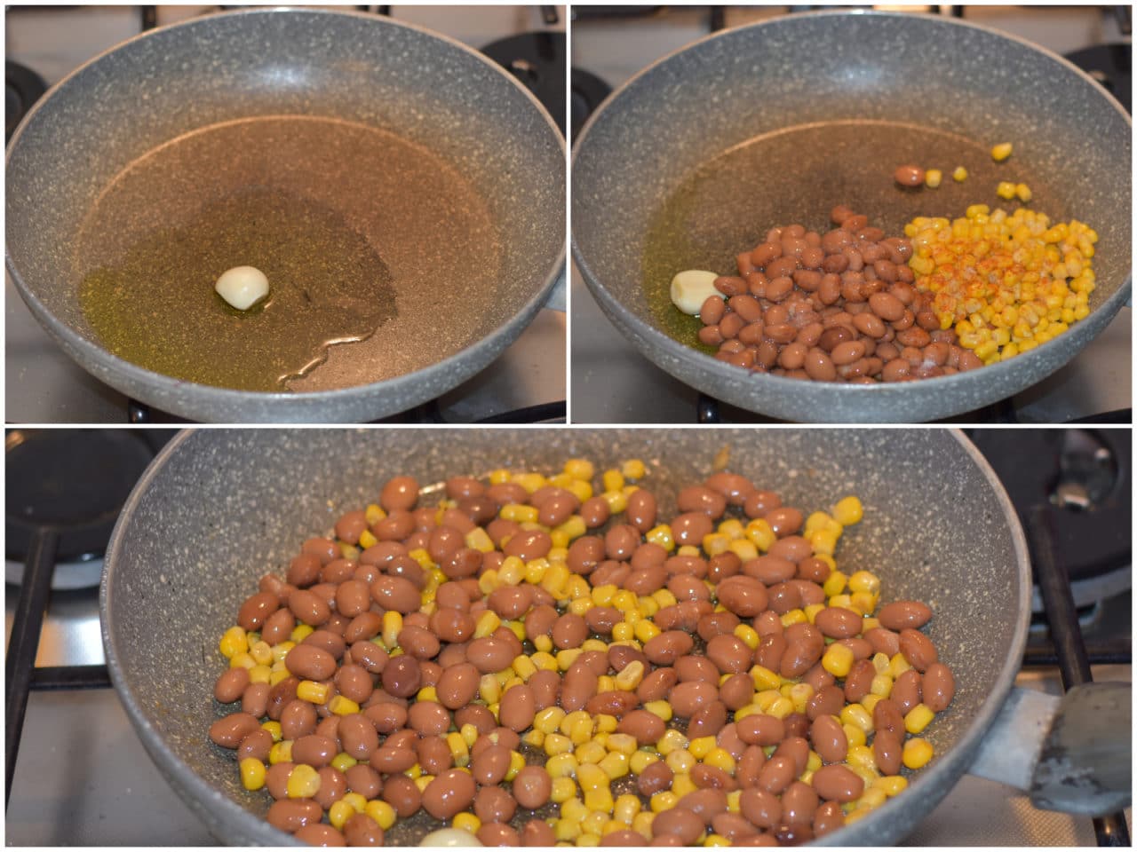 Nel frattempo, fate dorare l'aglio con olio in un'ampia padella antiaderente, poi unite fagioli e mais, condite con sale, pepe, paprica e cumino e lasciate insaporire.