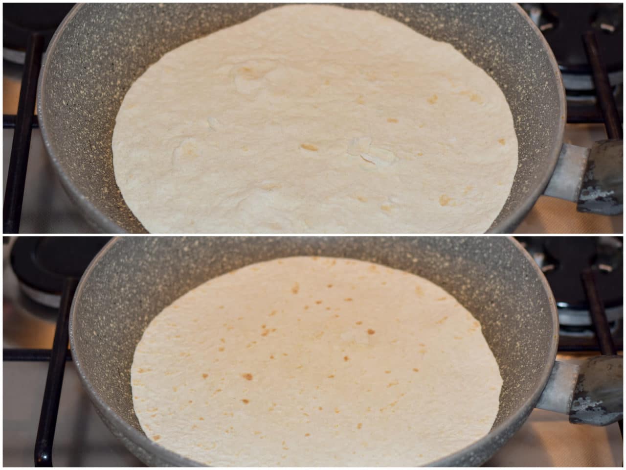A questo punto prendete 1 tortilla per volta e fatela scaldare dai due lati in una padella antiaderente.