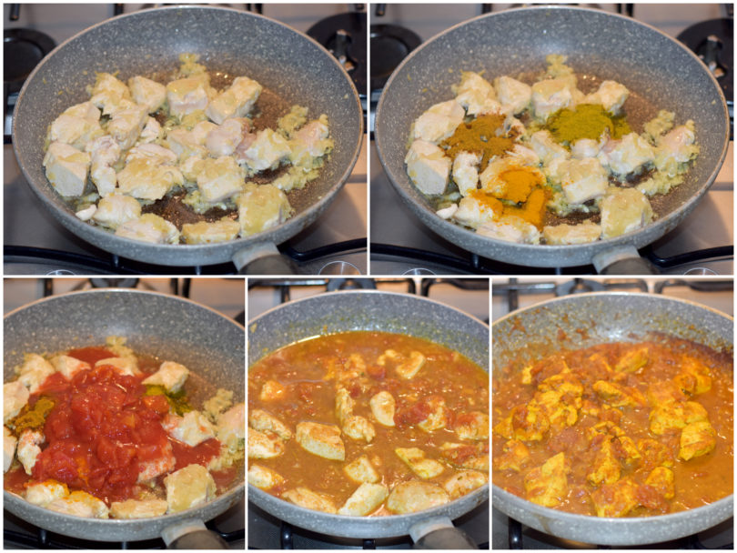 Aggiungete curry, curcuma, garam masala (o pepe), polpa di pomodoro e acqua e amalgamate, quindi continuate la cottura a fiamma medio-bassa per circa 30 minuti.