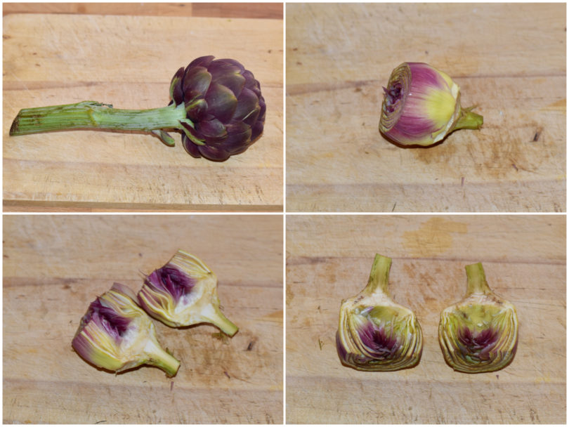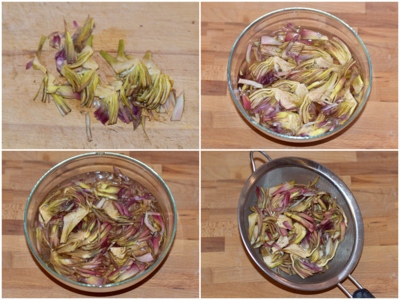 Innanzitutto mondate i carciofi (qui la guida per farlo al meglio), tagliateli a fettine e mettetele in una ciotola a bagno con acqua fredda e succo di limone per circa 20 minuti, poi scolateli.
