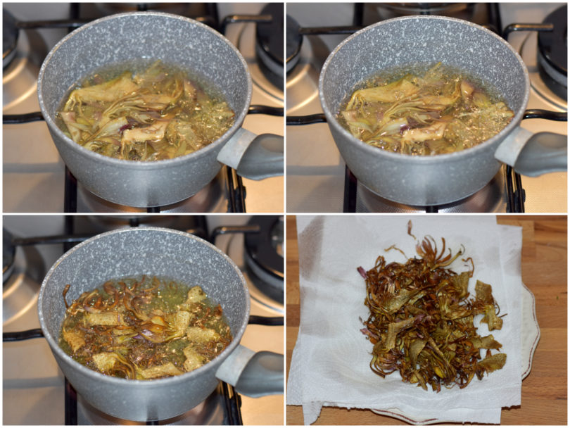 Tamponateli leggermente con carta da cucina o un canovaccio pulito, quindi friggeteli in olio ben caldo fino a doratura e scolateli su carta da cucina.