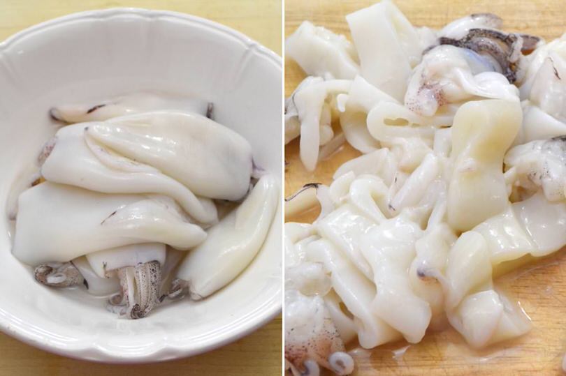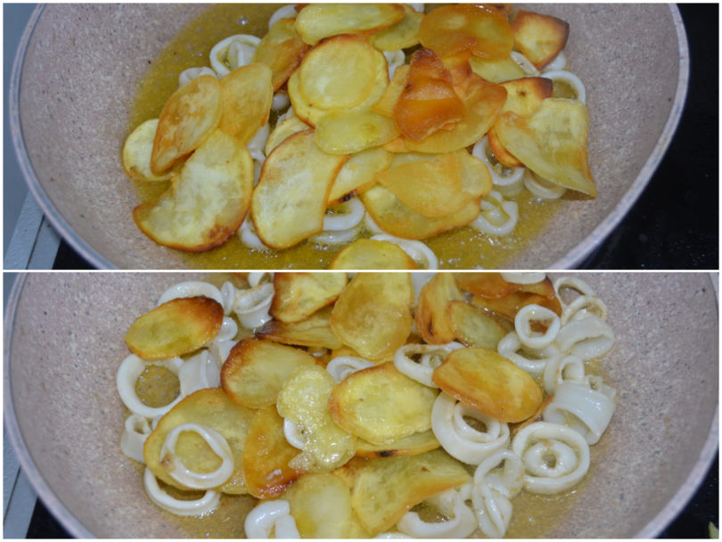 Sollevate le patate con una schiumarola, quindi nello stesso olio friggete anche i calamari.